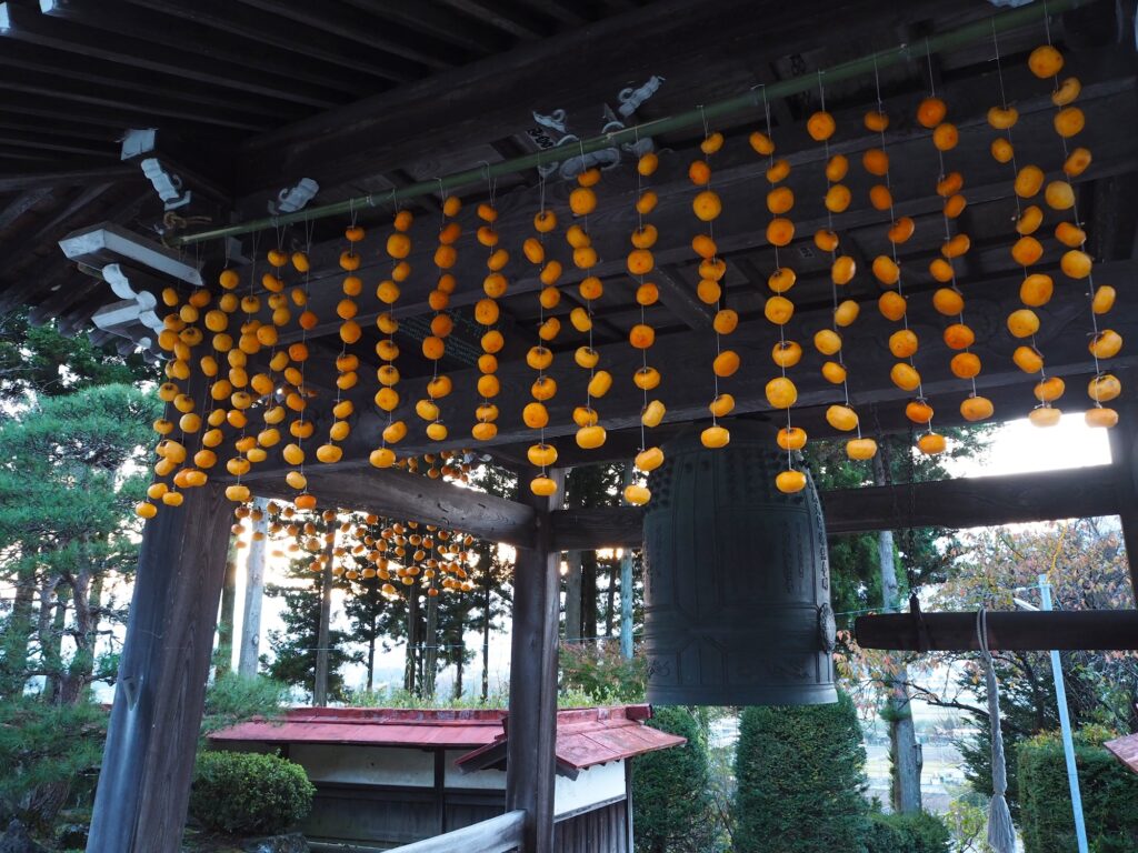 11月6日、その柿をもとに、無量寺さんと協力して干し柿作りのイベントを開催しました。急ではありましたが3名の方が手伝ってくださり、400個の柿で無量寺の鐘楼のまわりを飾ることができ、この柿は、縁起物として新年に無量寺関係者や参拝者の方に配布される予定です。ご協力くださった皆様ありがとうございました。