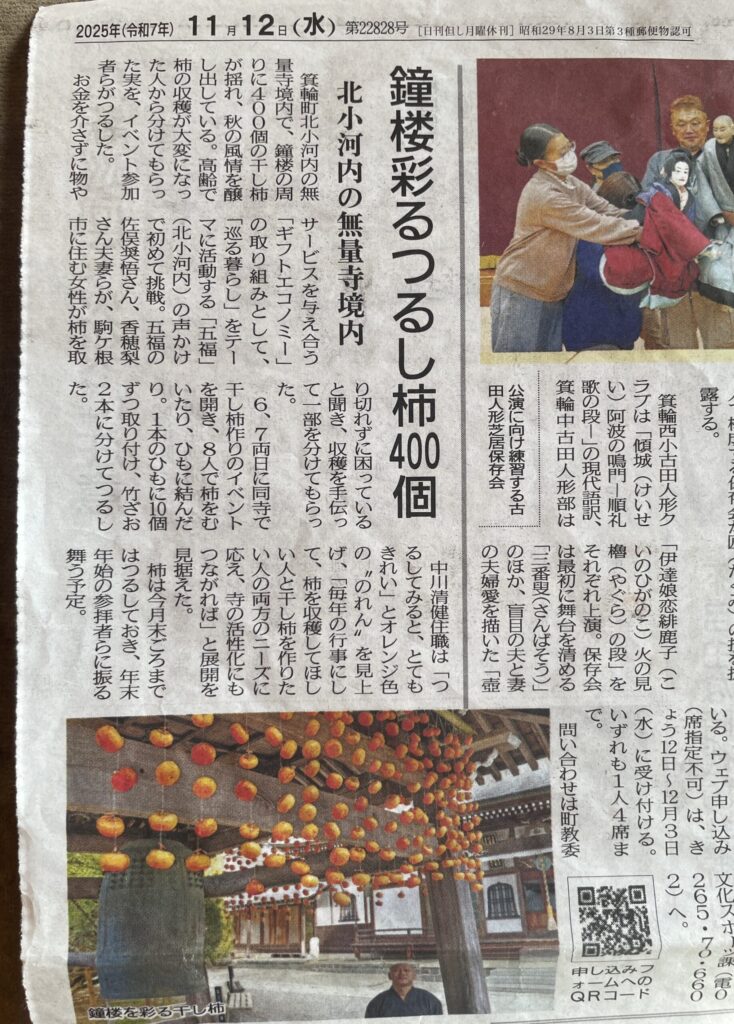 箕輪間新聞社様が2025/11/12日の記事にて無量寺での干し柿つ作りについて取り上げてくださりました。ありがとうございます。 2025年11月12日 投稿ナビゲーション 箕輪新聞社様が薪割りの体験会を記事にしてくださりました。信濃毎日新聞社様が五福の活動を記事にしてくださりました。