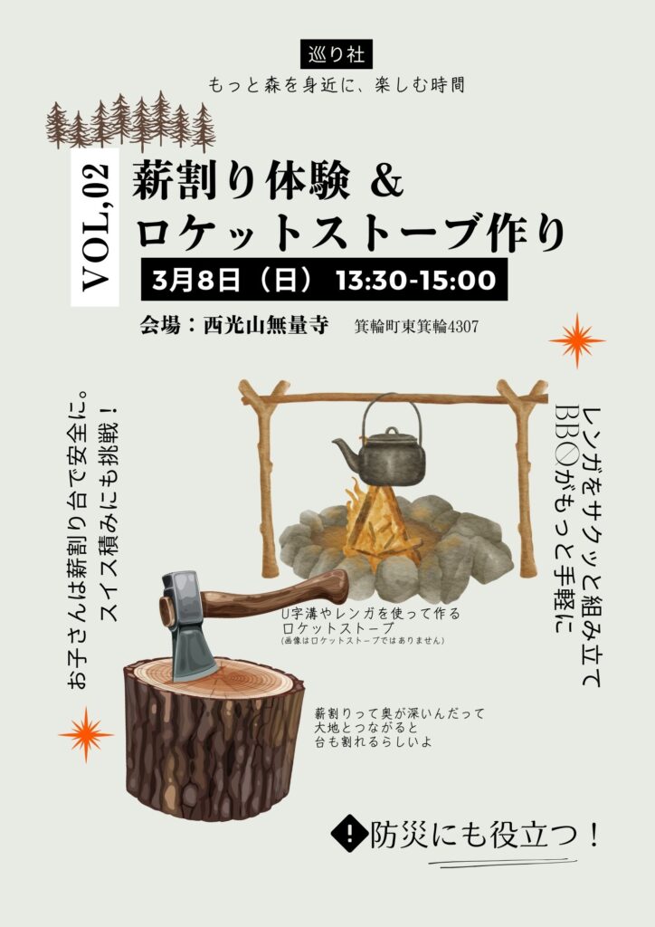 ①薪割り体験:巡り社が伐倒した木を、山から運びだし、薪割りをします。